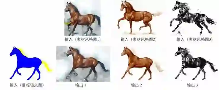纹理迁移技术作为计算机视觉和图形学领域的一个研究热点,能够将样图中的风格纹理自动迁移到目标图像中,本文提出了一种用户引导的纹理迁移技术,通过输入素材语义图、素材风格图及目标语义图,能够自动生成具有目标语义和素材风格的目标风格图,该问题描述如图 1 所示。