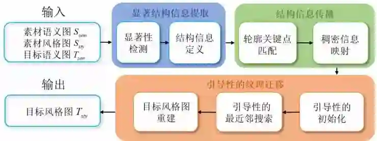 图 2:方法的总体流程。主要包含显著结构信息提取、结构信息传播和引导性的纹理合成三个步骤。