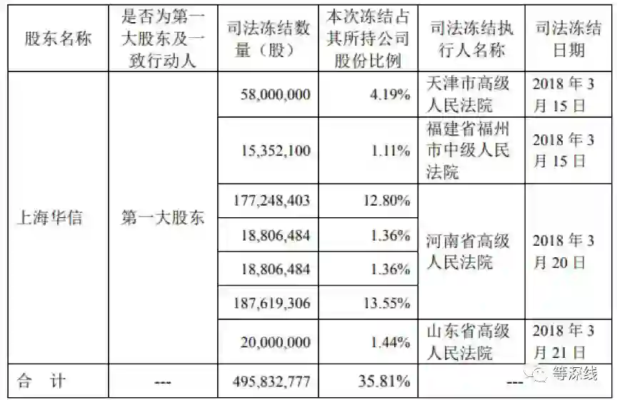 2018年3月30日,上市公司安徽华信国际控股股份有限公司(以下简称“华信国际”)发布了关于控股股东上海华信持有的部分股份被司法冻结的消息:上海华信所持股份累计被司法冻结495832777股,占其所持公司股份总数的35.81%,占公司总股本的21.77%。根据3月19日华信国际停牌价5.39元/股计算,本次冻结股份价值约为26.7亿元。