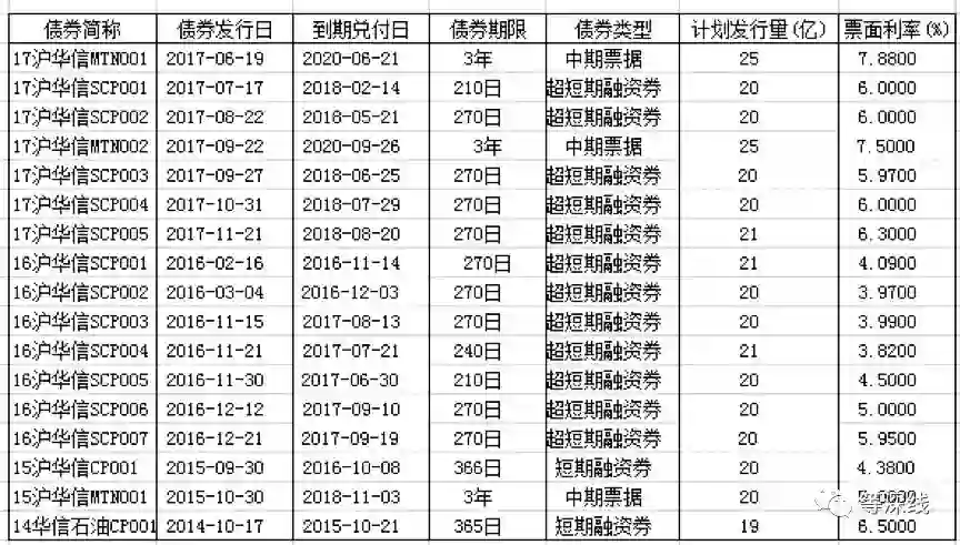 上海华信中期票据和短期、超短期融资券发行情况。《等深线》记者顾湘根据票据、融资券发行权威信息整理