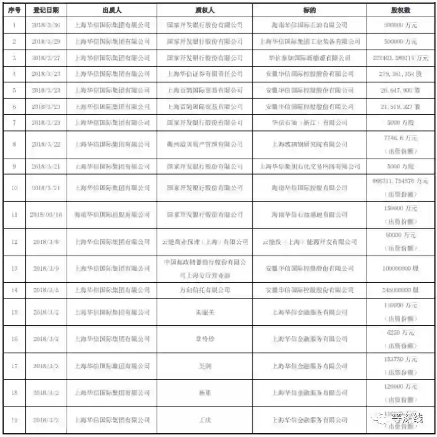 值得注意的是,2018年3月1日以来,上海华信及其子公司进行了多次股权和股票等资产的抵质押。