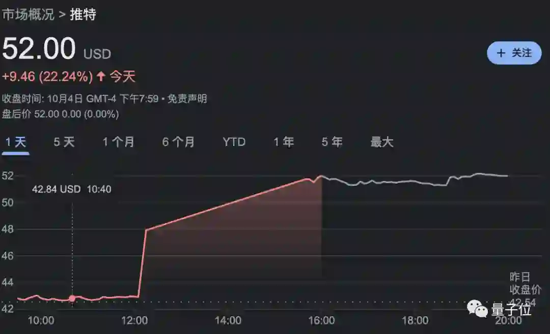 消息一出推特股价暴涨停盘,涨幅超22%;特斯拉股价也一度上涨6%,收盘涨幅近3%。
