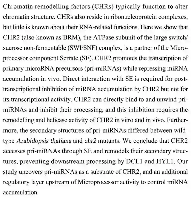 (导读 郭怿暄)染色质重塑因子(CHRs)的常见功能是改变染色质结构,但它们同样存在于核糖核蛋白复合物中,其功能尚不清楚。本研究发现SWI/SNF复合体中的ATP酶CHR2可以促进初级miRNA(pri-miRNAs)的转录,通过与微加工因子Serrate直接作用,重塑pri-miRNAs的二级结构,阻止其下游由DCL1和HYL1参与的加工,从而抑制miRNA的生成。
