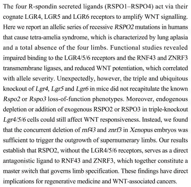 (导读:阿金)Rspo分泌性蛋白家族的4个成员(RSPO1–RSPO4)通过其受体LGR4/5/6放大WNT信号。本研究报告人类等位基因系列的隐形RSPO2变异导致先天性四肢切断症,三重敲除小鼠的LGR4/5/6并不致使Rspo2或Rspo3功能性丧失表型出现,而同时移除非洲蟾蜍胚胎中的 rnf43和znrf3则导致多余肢体的生长。该研究结果对再生医学和WNT相关癌症研究具有重要意义。