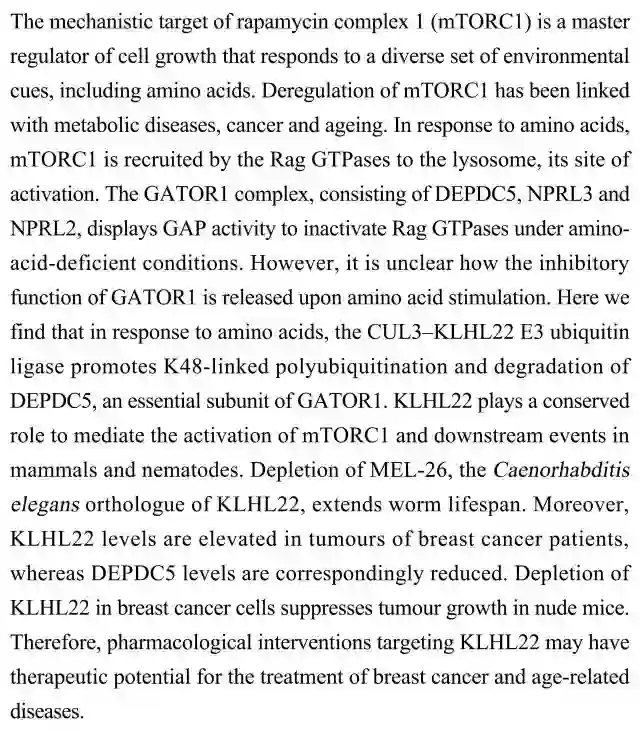 (导读 过泽远)在氨基酸等环境信号刺激下有如下通路发生:GATOR1复合体活性下调 - Rag GTP酶激活 - mTORC1被招募至溶解体并激活。该通路与多种疾病相关,但GATOR1复合体被初始信号抑制的机制尚不清楚。本研究发现在氨基酸信号下,CUL3-KLJL22 E3泛素剪接酶可促进GATOR1复合体组分DEPDC5的降解,从而抑制GATOR1。研究者在在哺乳动物和线虫中验证了KLJL22的这一功能,说明KLHL22可能成为相关疾病的药物靶点。