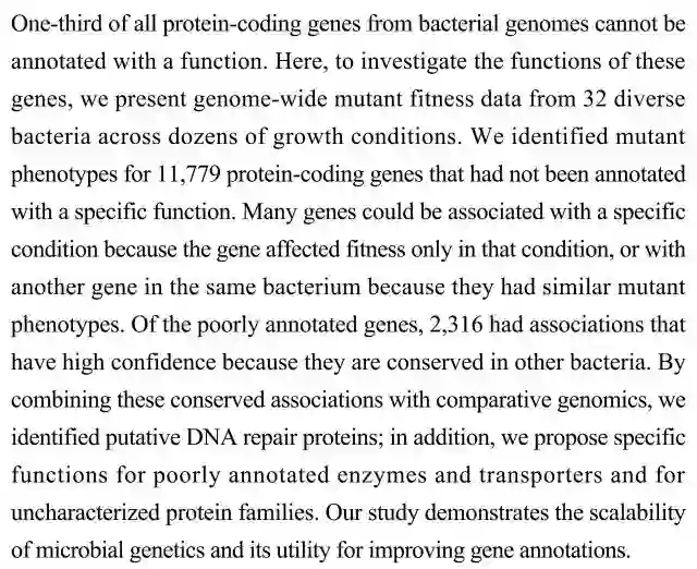 (导读 郭思瑶)细菌基因组中三分之一的编码蛋白质的基因还没有功能注释。科研人员为了探究这些基因的功能,鉴定了不同生长条件下11779个编码蛋白质基因的突变表型,通过对保守的联系基因关联进行比较基因组研究,获得了假定DNA修复蛋白、某些酶、转运蛋白和未知蛋白家族得到了的功能注释。该研究体现了微生物遗传学在基因注释上的应用。