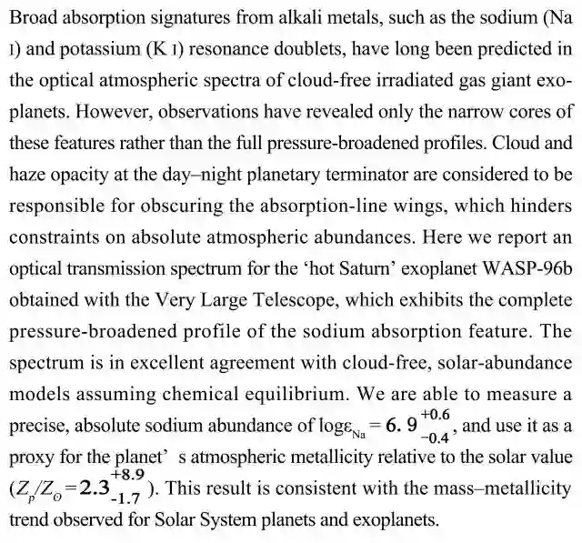 (导读 雷鸣)本文报道系外“热土星” WASP-96b的光学透射光谱,该行星具有完整钠吸收特征,极其符合无云大气模型。研究人员精确测量出绝对钠丰度为并据此推算该行星大气与太阳系金属丰度相对比值为
