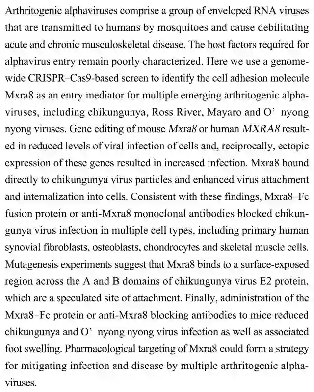 (导读:张铭函)关节炎甲病毒是一组有包膜的RNA病毒,通过蚊子传播导致急慢性关节炎。本研究利用全基因组筛查识别出Mxra8 是多种致关节炎甲病毒的入侵媒介,并通过编辑鼠与人的Mxra8减少了细胞的病毒感染。此发现为减少多种关节炎感染提供了药理学新策略。