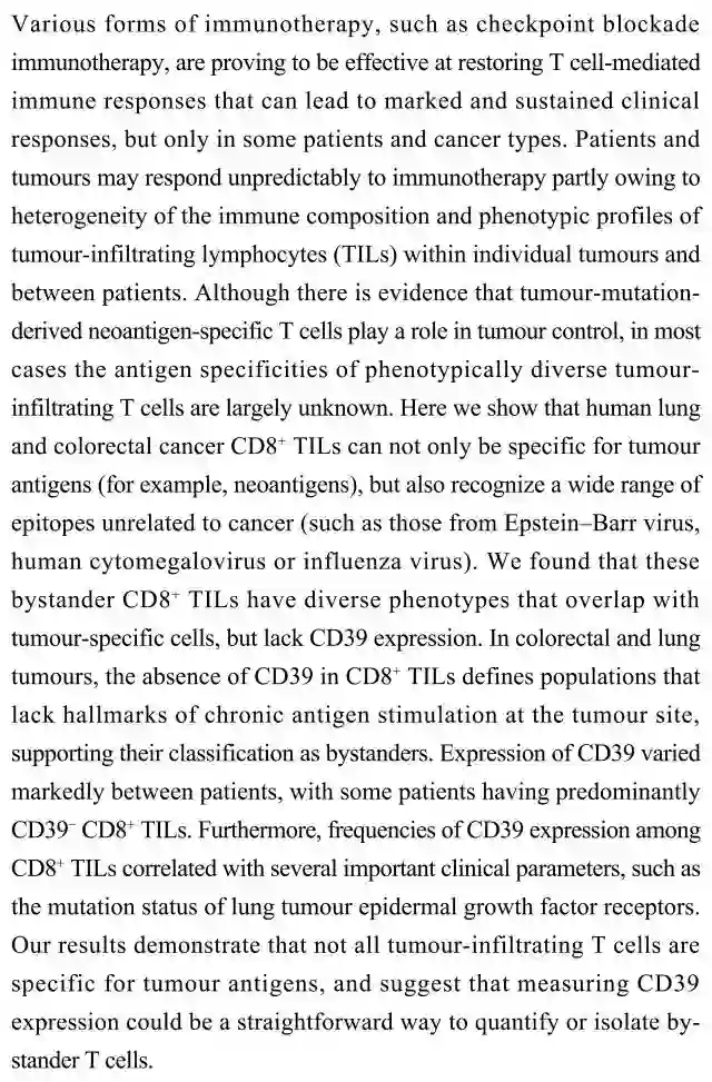 (导读 陈月欣)肿瘤免疫疗法在临床上效果显著,但并不适用于所有的患者及癌症类型。其中部分原因在于浸润肿瘤的T细胞的表型差异。本研究发现,这些细胞中的一部分为表型与肿瘤特异T细胞相似但缺乏CD39的旁观者CD8+T细胞。癌症患者CD39的表达程度与多项临床指标相关联,可用于量化或分离旁观者T细胞。