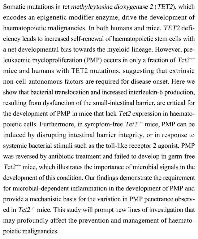 (导读 郭怿暄)表观遗传修饰酶TET2基因出现突变可驱动造血系统恶性肿瘤的发生。人类和小鼠TET2缺乏造成造血干细胞自我更新增加并倾向向髓系细胞发育,但只有部分出现白血病前骨髓增生(PMP)。本研究发现小肠屏障功能障碍引起的细菌迁移和白介素6生成增加是Tet2缺乏小鼠中PMP发展的重要因素。破坏小肠屏障或激活无症状Tet2-/-小鼠细菌刺激应答可诱导PMP发生;给予抗生素治疗可抑制PMP。