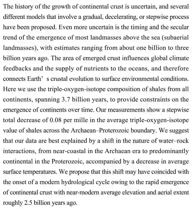 (导读 卓思琪)本研究利用37亿年间各大洲页岩三氧同位素组分推断陆地出现时间,结果表明太古代-元古代边界三氧同位素均值呈每英里0.08下降,最可能因为水岩作用性质转变伴随地表温度下降。这一转变可能与25亿年前陆地迅速出现引起的现代水文循环起始相符。