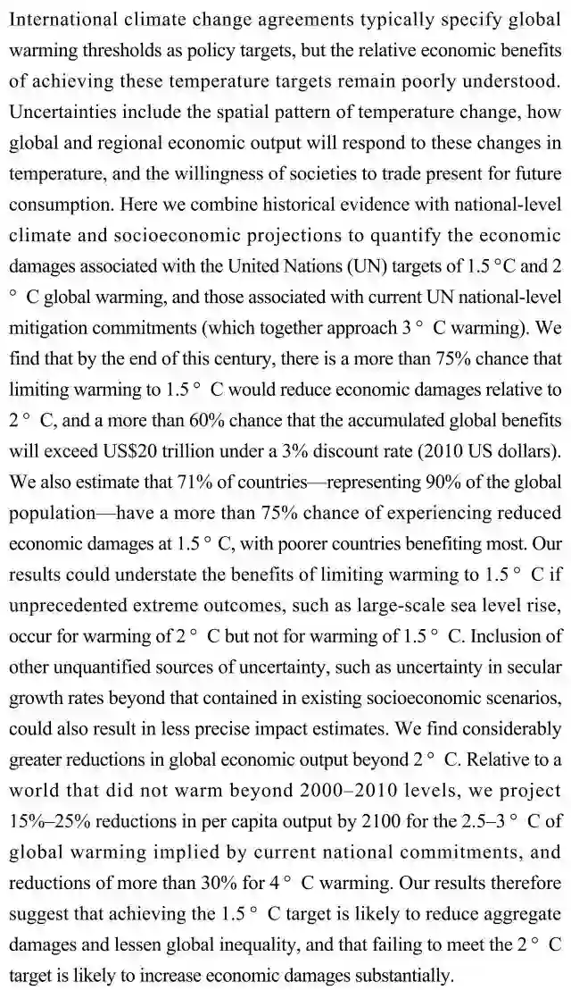 (导读 张晶淼)国际气候变化协定常以全球变暖阈值为政策目标,但达到目标的相关经济效益尚不明确。本研究利用历史证据结合国家气候和社会经济计划数据估算,发现实现气温升高1.5 °C以内的目标很大可能会减少全球总损失并减轻全球不平等,若不能达到2 °C 的目标,经济损失很可能会大幅度增加。