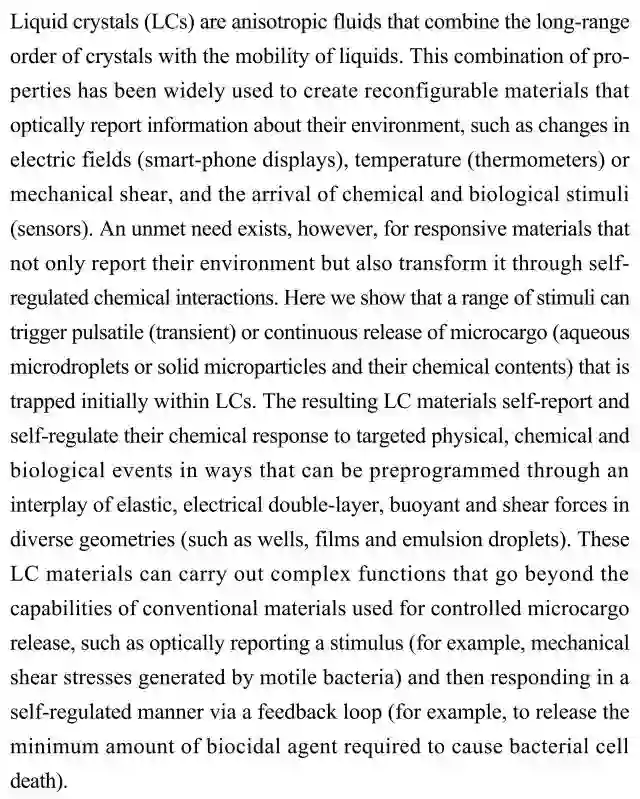 (导读:阿金)液晶被广泛应用于能够以光学方式反馈其环境信息的可重构材料中,但仍无法满足响应性材料的需求。本研究表明一系列刺激可以触发液晶瞬时或连续释放最初捕获的微型容物。该液晶能够对物理、化学和生物事件以化学响应的方式进行自评估和自调节,同时还能执行如以光学形式报告外来刺激等复杂功能。