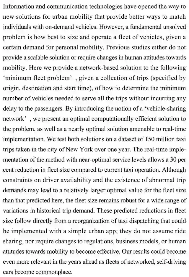 (导读 胡琦琳)本研究引入“车辆共享网络”的概念,为优化出行和减少乘客延误的“最小车队问题”提出了一个在计算上行而有效的最佳解决方案。根据纽约长达一年多的1.5亿次出租车出行数据,并与目前的出租车运营相比,该最优化智能管理可使车队规模减少30%。随着网络化自动驾驶汽车的普及,该成果在未来几年可能更有意义。