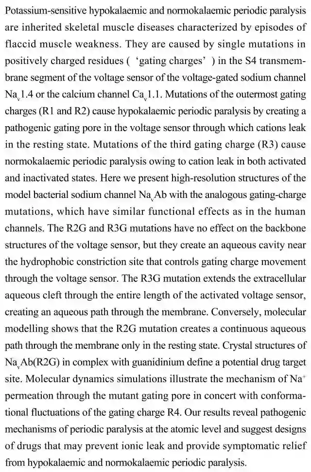 (导读:阿金)钾敏感型低钾血症和常钾型周期性瘫痪是遗传性骨骼肌疾病,由电压门控钾离子通道或钙离子通道的电荷残基突变造成。本研究展示功能类似于人类离子通道的细菌钠离子通道NavAb模型结构。 R2G和 R3G突变在该离子通道的电压感受器附近形成含水空腔,控制门控电荷移动。分子动态模拟显示Na+通过突变门控核心的渗透机制与门控电荷 R4构象变化一致。该结果在原子级别上揭示了周期性瘫痪致病机制,并提出缓解症状的药物设计思路。