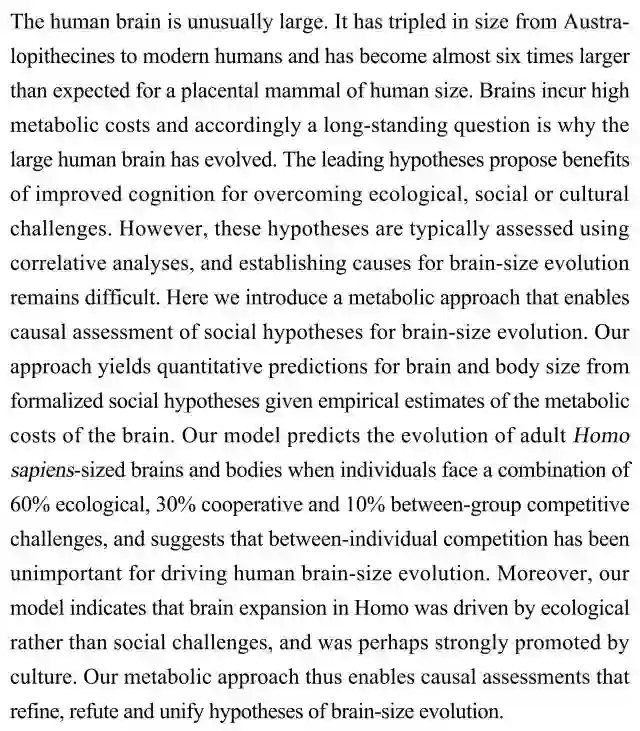 (导读 董堃)主流假说通过相关性分析,认为人类大脑之所以会进化出体积巨大的特点,是为了克服生态、社会和文化的挑战。本文使用代谢模型,对智人脑容量的进化动因进行了量化因果分析,结果显示生态学挑战是驱动进化的主因,而文化中的人际间竞争等因素也有推进作用。