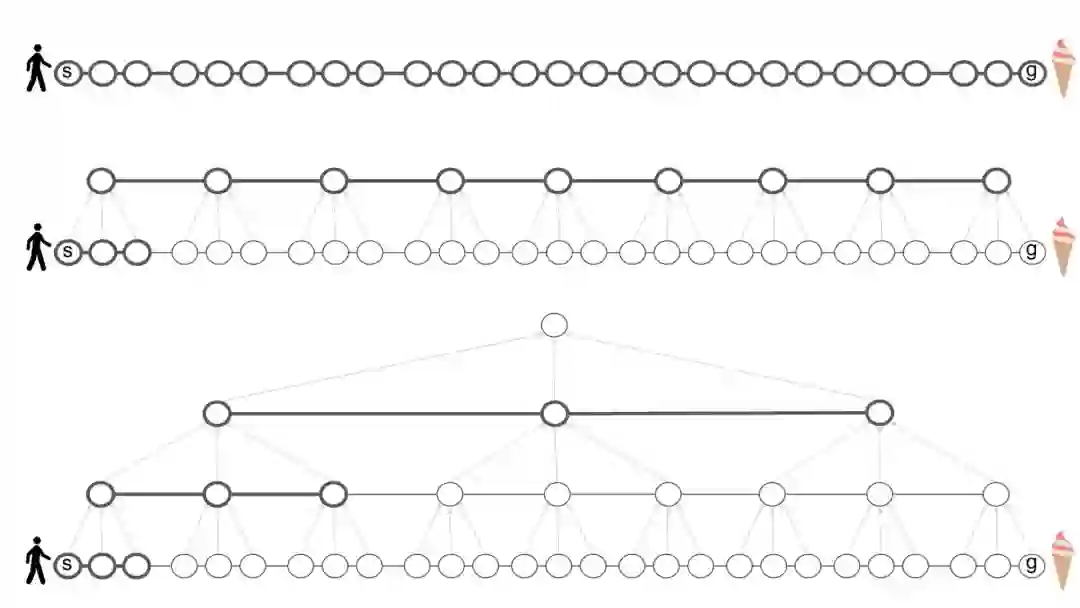 如下图所示,线条较粗的节点和边表示做规划必须考虑的、停留在短期记忆内的内容,用于对规划进行计算,而灰色箭头则表示簇的成员。我们观察到,在低级别图 G 中规划如何从状态 s 到状态 g 至少要花费与实际执行计划(下图上方)一样多的步骤,引入高级图 H 可以缓解此问题,从而降低计算成本(下图中间) ,同时扩展层次结构递归(hierarchy recursive),进一步减少规划所需的时间和记忆量(下图底部)。