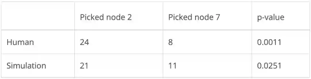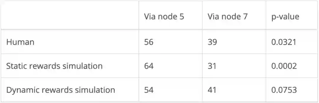 人类组和两个仿真组均有95名参与者。空假设(null hypothesis)由数量相等的参与者选择通过节点5和通过节点7的路径来表示,因为在没有任何其他信息的情况下,假设两条路径的长度相等,参与者选择任意一条路径的概率均为50%。