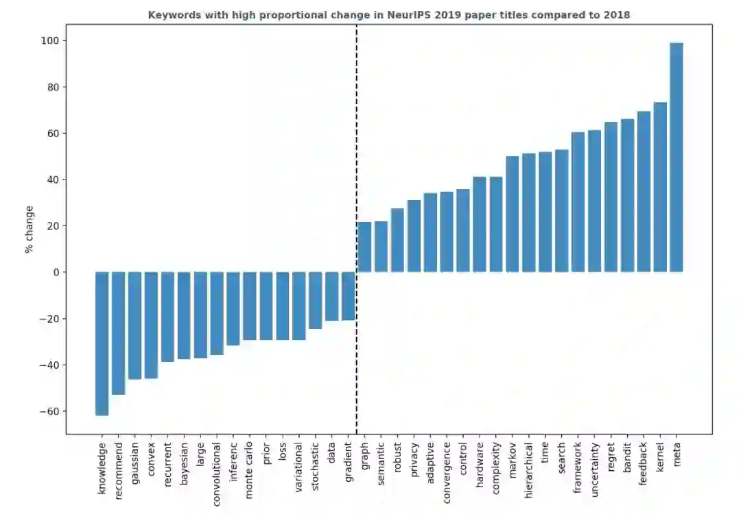 强化学习甚至在机器人技术之外的领域也越来越流行。有显著正变化的关键词有bandit、feedback、regret、control。