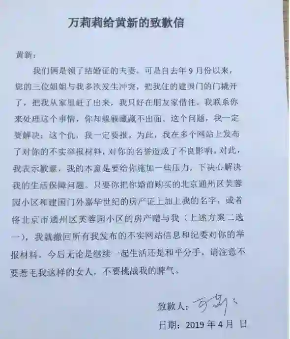 万莉莉给黄新的道歉信,图片来自黄新朋友圈