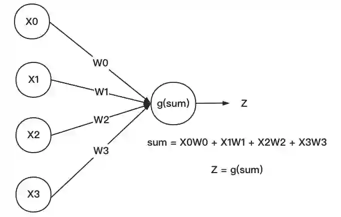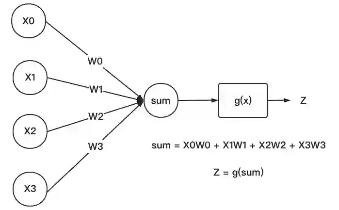 科学家们通过模拟人脑中的神经元结构,设计出了能在计算机中表示的单个人工神经元,结构如下: