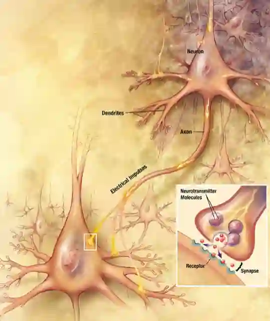 在神经元之间数据的传递是通过微弱的电流,术语叫「动作电位」来传递的,这里就不展开解释了。