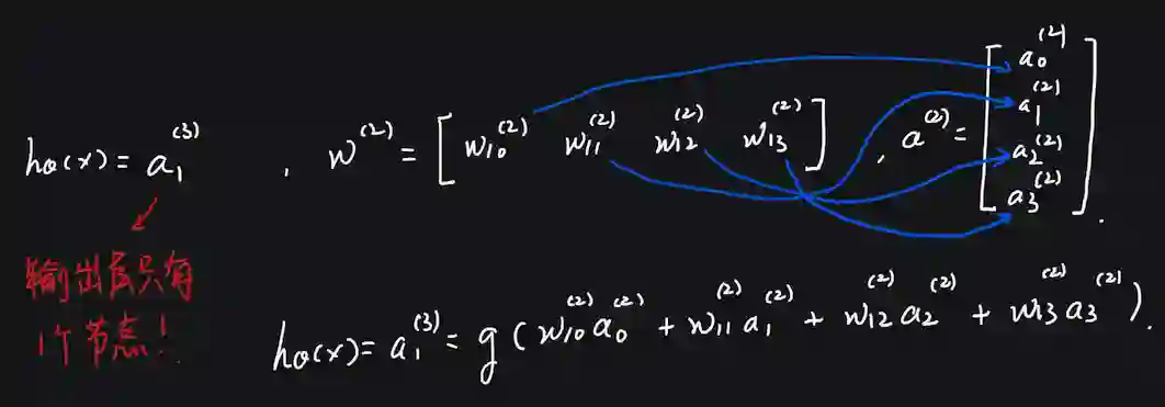 可以看到第二层的每个神经元的值都与第一层所有神经元输出有关。相应地输出层计算公式也类似,要注意输出层只有一个节点哦,所以 是 1 X 3 大小: