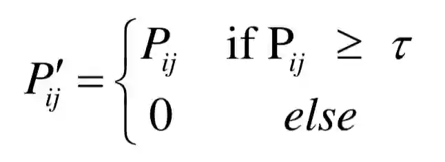 考虑到标注数据中可能存在不准确的情况以及标签在训练和测试集中共现的次数可能会相差比较大,因此我们设置了一个阈值剔除相关性比较弱的噪声的影响。对于上面得到的矩阵 P,只有其值大于某特定值(论文中为 0.5)的时候才会考虑,否则矩阵中这两个标签的相关度会设置为 0: