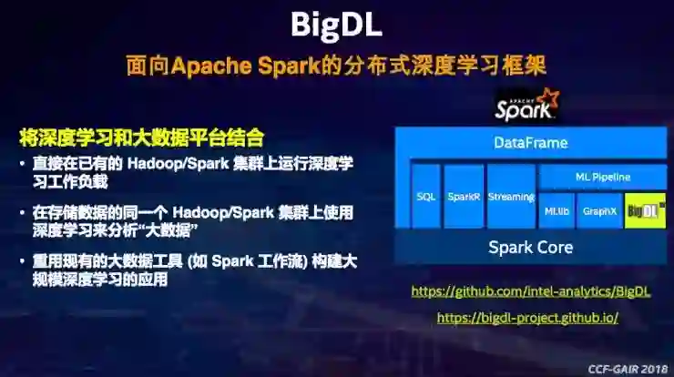 基于Spark推出的BigDL是Spark上标准的库、标准的组件,能够和这些大数据、生态系统里面的不同的分析、处理的组件非常好地整合在一起。BigDL与目前主流的深度学习框架Caffe、Torch、TensorFlow所能实现的功能相同。虽然市面上已经有主流的深度学习框架,英特尔推出BigDL则是因为看到了将大数据分析与人工智能结合起来的一个空白点。BigDL可以直接在现有的Hadoop和Spark的集群上运行,不需要对集群做任何修改。