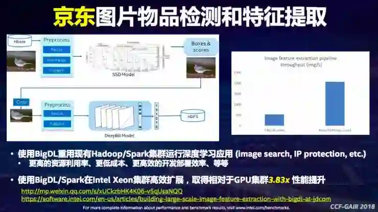 AI的三个核心点在大数据、算法、算力,现在很多人认为要有足够的AI算力,非GPU不可。京东的这个案例体现了BigDL与英特尔至强可扩展处理器配合,对整体深度学习表现的提升。戴金权告诉雷锋网,京东这个案例一开始是建立在多个GPU之上的,他们的团队在Caffe上训练,在开发、部署、性能方面都碰到问题。英特尔将京东方面迁移到Spark上面,跑在1200个逻辑的核,一台服务器支持50个逻辑,大致用了24台服务器,利用Spark这样的端到端流水线处理,与之前用GPU的方案相比可以达到差不多3.8倍的性能提升。