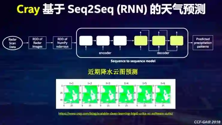第五个案例是们和Cray公司(美国做超级电脑的公司)合作。合作内容是做近期的降水云图的预测,通过Seq2Seq的模型,把过去一小时的卫星云图做了一个序列,输入到模型里面,能帮预测下一个小时每10分钟这个卫星云图的变化,通过这个来进行一些降水的分析。