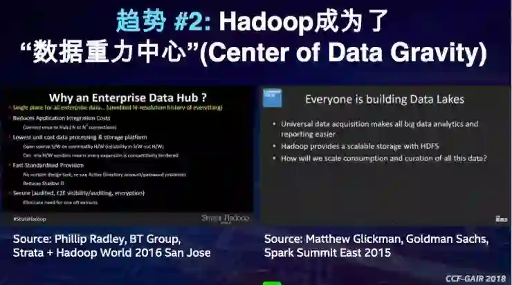第二个趋势是业界大数据的发展,不管是互联网公司还是传统企业,大家都以Apache Hadoop建立起数据平台,这个平台聚集大家处理过的和未处理的数据,从而你能够将各种数据的处理、分析和应用,应用到这个平台上。从这个意义上说,任何数据处理和分析的框架、应用,包括深度学习的应用,都要能够非常好地和Apache Hadoop为标准的数据平台交互。