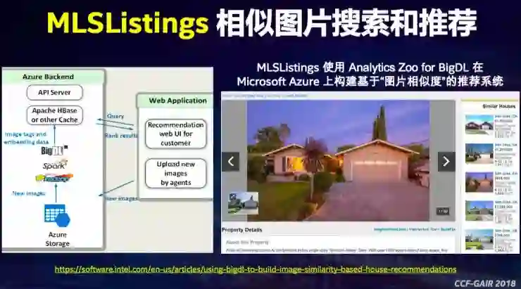 第二个案例是英特尔和MLSListings合作的案例,他们是加州的不动产交易商,他们可以识别用户浏览的房屋图片,为用户推荐相似的房屋。这套系统构建在Microsoft Azure上。
