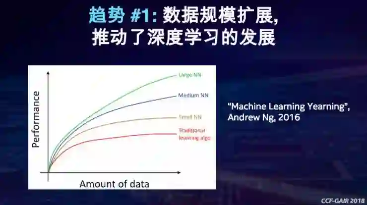 第一个趋势,今天深度学习的发展很大程度上是由于数据规模来推动的。由下图可见,随着横坐标数据规模的增长,纵坐标显示的神经网络模型就越有效,越准确。任何深度学习的系统、框架、应用都要能够处理大规模的数据。