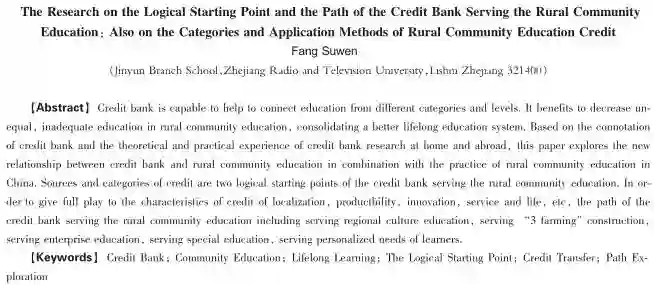农村社区教育具有区域特点和地方特色,是“农村社区教育学分银行”经验和理论的重要探索基地与突破口。因此,本文以农村社区教育为切入点,探索区域学分银行的理论和实践,具有一定理论意义和实践价值。