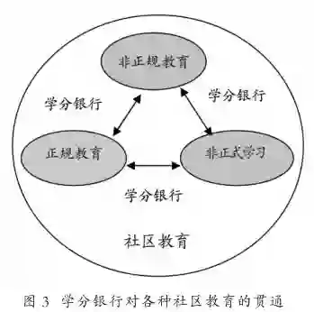 可见,社区教育方式的灵活性、多样性和创新性,充分满足了学习者的学习需求。学分银行以终身教育的理念整合正规教育、非正规教育、非正式学习等各种形式的学习活动,是各级各类教育的“连接点”和“融通点”,给社区教育形式的多元化创造了前提(见图3)。也就是说,通过学分银行,有效链接与贯通了各种教育,促进了社区教育方式更加灵活多样。