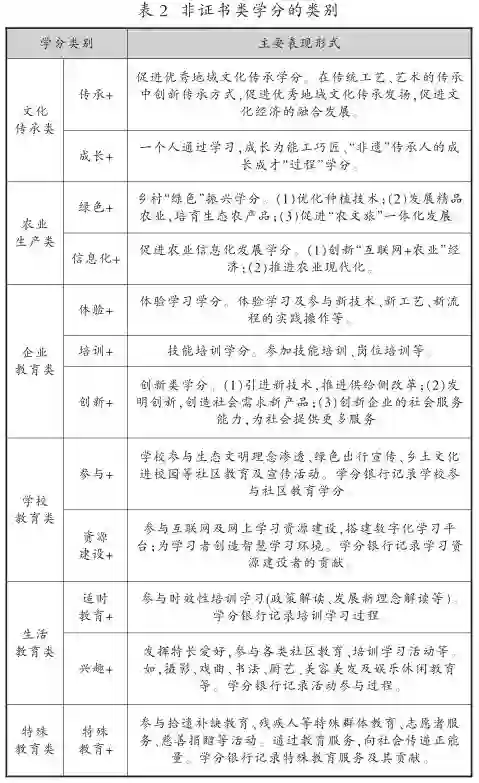“学习是指个人通过经历、实践、研究和参加教育活动,在信息、知识、理解力、态度、价值观、技能、能力或者行动方面的获取和调整[22]”。一个人的学习具有极丰富的内涵和外延,所谓“腹有诗书气自华”“近朱者赤,近墨者黑”等,表现出学习途径与学习成果的多样性和丰富性。其中,学习者个人在工作生活、生产劳动、娱乐休闲中提高自身素养(升级价值观,产生获得感、成就感等)的过程,是很难“量化”并被证书记载的,但实际上又对一个人产生了积极“影响”。学分银行记录学习者通过非正式学习、环境潜移默化的“影响”而得到提升的“过程”,并将这类学分归为非证书类学分。相对于整个学习历程来说,非证书类学分表现出阶段性、过程性,对学习者个人而言,具有参与性、成长性、发展性和分享感、收获感等特点(见表2)。