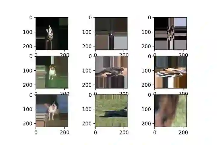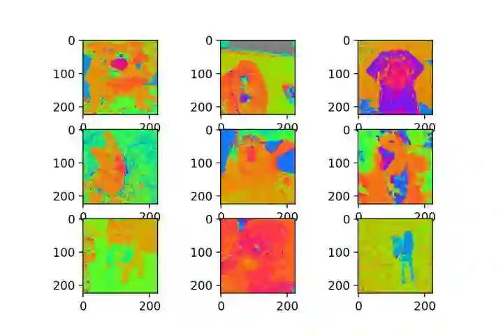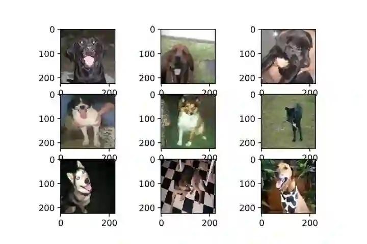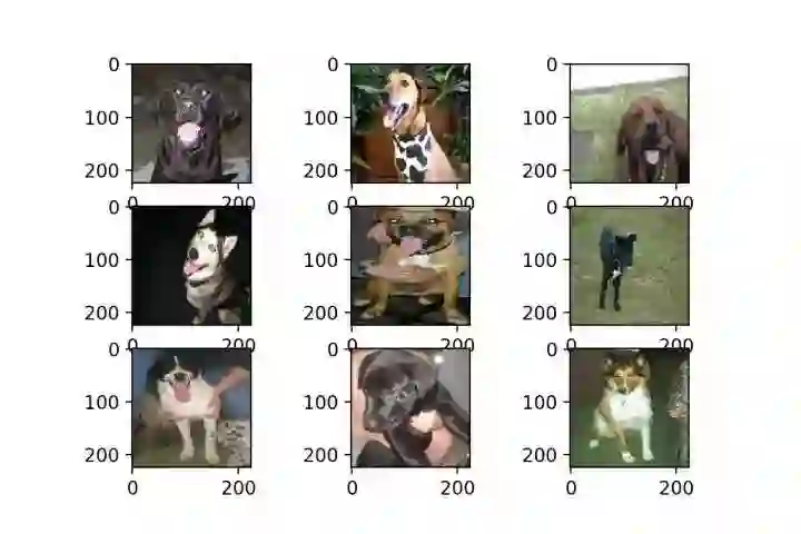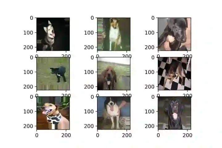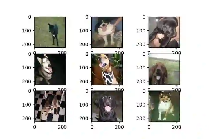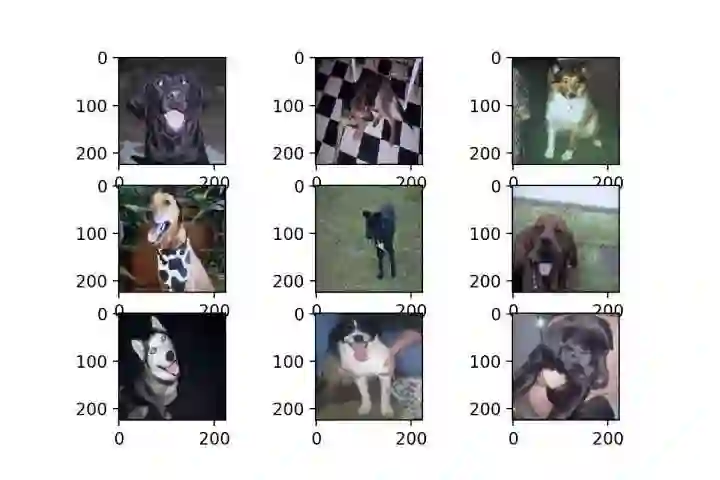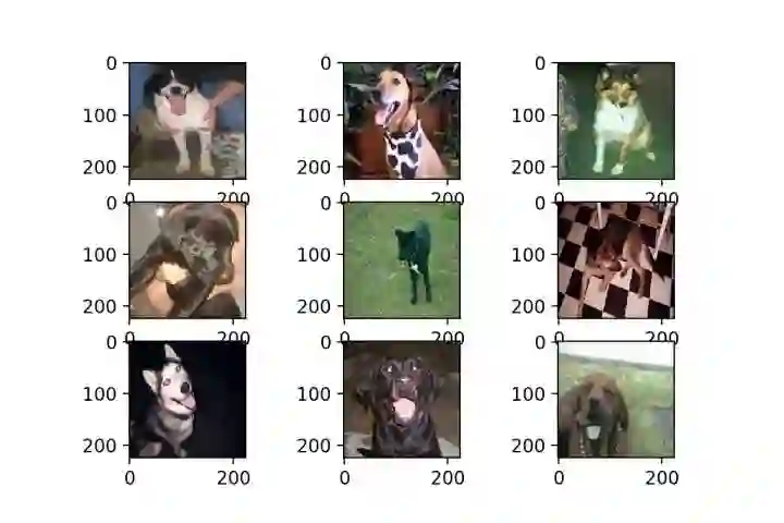 我们测试选用的是kaggle dogs vs cats redux 猫狗大战的数据集,随机选取了9张狗狗的照片,这9张均被resize成224×224的尺寸,如图1: