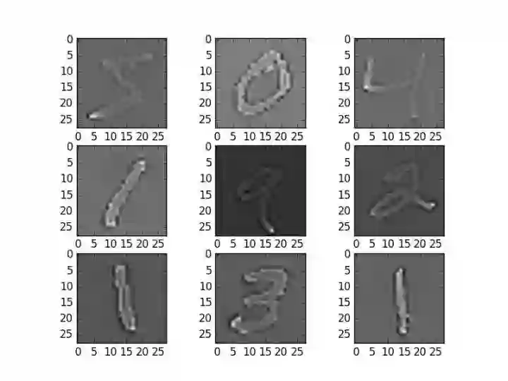 很抱歉的是,本人使用keras的官方演示代码,并没有复现出zca_whitening的效果,当我的图片resize成224×224时,代码报内存错误,应该是在计算SVD的过程中数值太大。后来resize成28×28,就没有内存错误了,但是代码运行了一晚上都不结束,因此使用猫狗大战图片无法复现效果,这里转发另外一个博客使用mnist复现出的结果,如下图4。针对mnist的其它DataAugmentation结果可以看这个博客:Image Augmentation for Deep Learning With Keras,有修改意见的朋友欢迎留言。