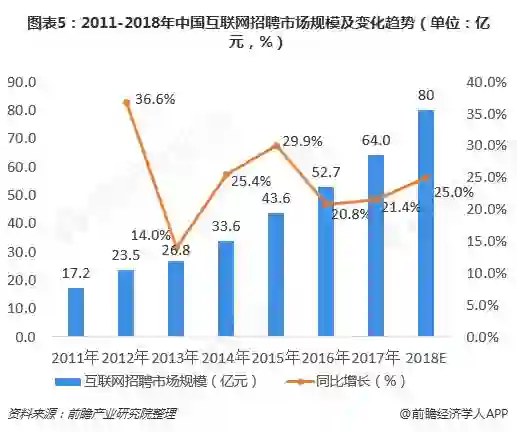 1、互联网行业在飞速发展:数据显示,2011年我国互联网招聘市场为17.2亿元,2018年上升至80亿元,并保持20%-30%的增长率。