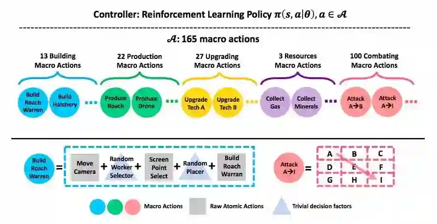 研究人员一共总结了165个大型操作,其中建造13个、爆兵/补农民22个、科技树27个、采矿/采气3个、对抗100个。图片底部是人为编码的游戏规则先验知识(如科技树)和如何进行操作(巢穴造哪儿),也就是说,它帮控制器省去了不少决策过程和操作细节。