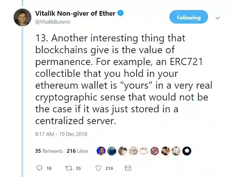 13. 区块链提供的另一个有趣的事情就是价值的持久性。比如,从真正的加密意义上说,你在以太坊钱包中持有的一个 ERC721 收藏品就是属于“你的”,而如果该收藏品存储在中心化服务器中,则情况就不是这样了。