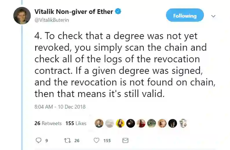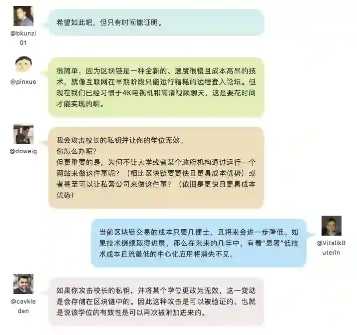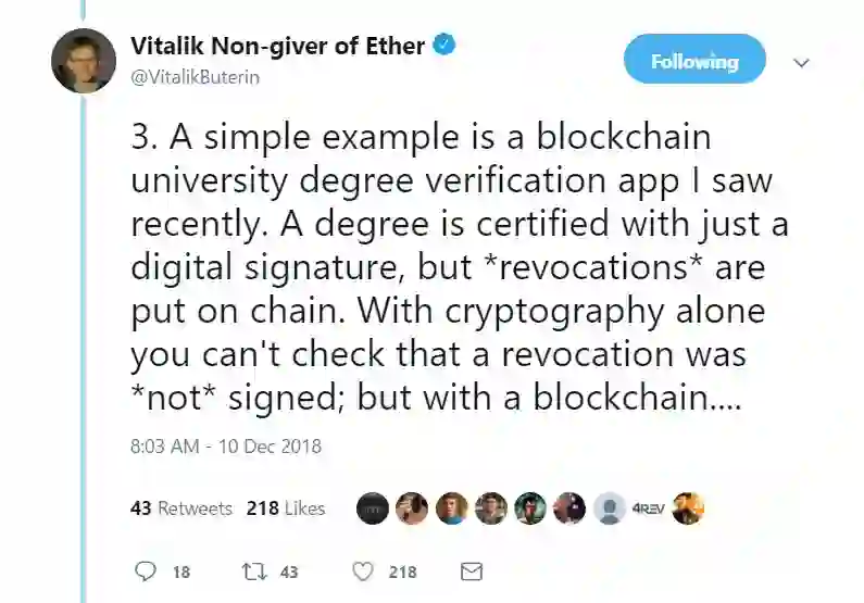 11月26日,Vitalik在接受媒体采访时表示,加密货币和跨境支付是区块链技术最适合的行业,而一些行业(如IBM)对区块链技术的误用导致了“浪费时间”。谈到非金融应用领域时,Vitalik表示他喜欢在新加坡所实施的大学学位认证想法。这项技术可让教育机构在区块链上以数位方式发放教育证书。