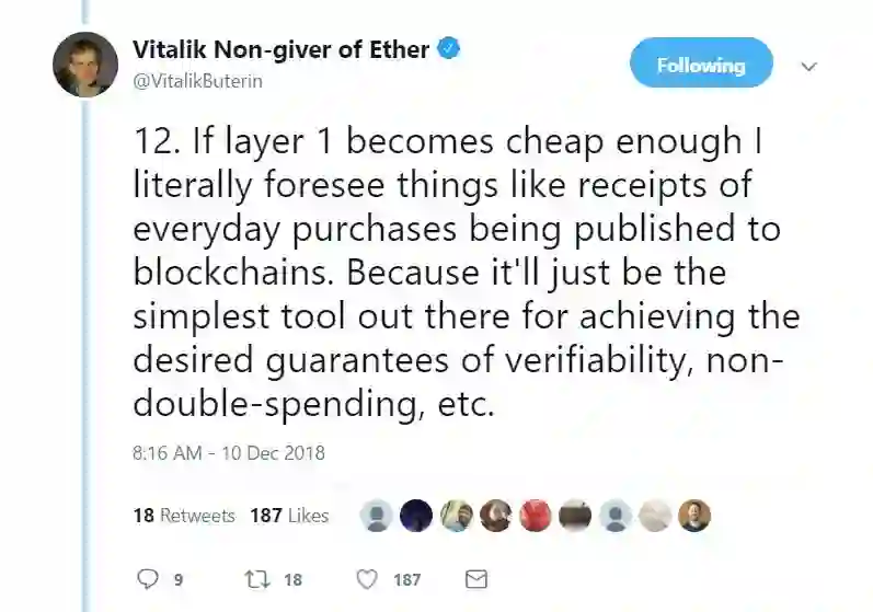 12. 如果第1层变得足够便宜,我简直可以预见,诸如我们日常消费的收据都会公布在区块链上。因为区块链是实现我们所需的可验证性和非双花消费的最简单的工具。