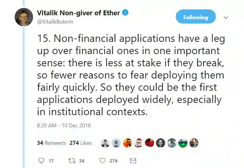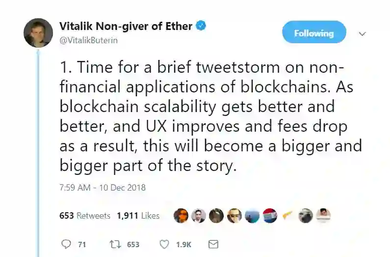 12月10日,Vitalik在 Twitter 平台连发了15条推文,阐述了区块链技术在非金融领域中的应用,表示区块链在非金融领域的应用比在金融领域的应用更具优势。我们一起来看一下推文的具体内容吧。