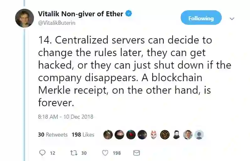 14. 中心化服务器可以决定在之后的时间更改规则,它们还可能被攻击,或者还可能因为该公司的倒闭而被关闭。但是一张区块链默克尔收据是永远都在链上的。
