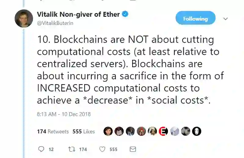 10. 区块链并不是关于削减计算成本(至少相对于中心化服务器来说是如此),而是关于通过*增加*计算成本的方式来实现*社会成本*的*减少*。