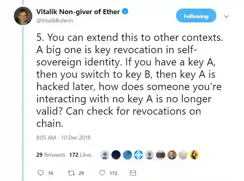 5. 你可以将这个例子延伸到其他情境中。其中一个很典型的就是在自主身份情境中的密钥撤销。如果你持有某个密钥A,之后你切换成了密钥B,随后密钥A被黑客攻击了,那如何才能让某个正在和你互动的人知道密钥A已经无效了呢?查看一下链上的撤销记录就可以了。