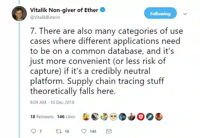 7. 区块链还有很多其他类型的用例,这些用例都需要建立在一个公用数据库的基础上,且如果某个平台在中立性方面靠得住,那就更加方便了(或者存在更少被操控的风险)。从理论上来说,供应链追踪就是如此。