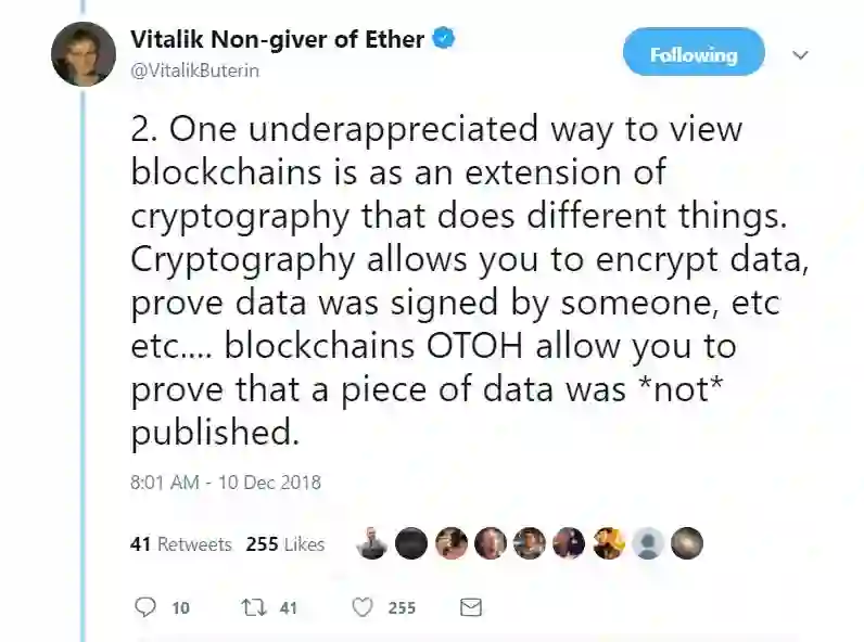 2. 有个不被重视的观点是将区块链视为密码学的延伸,认为区块链领域从事的是与密码学不一样的事情。密码学允许我们对数据进行加密、证明数据是由某个人签名过了的...而区块链允许我们证明某条数据*没有*被公布出去。